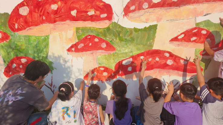 7月22日至25日,靈光村實(shí)踐分隊(duì)緊扣當(dāng)?shù)?ldquo;蘿卜之鄉(xiāng)”“菌菇基地”的產(chǎn)業(yè)特色,巧妙融入千年虞姬傳說(shuō),展開藝術(shù)創(chuàng)作。團(tuán)隊(duì)成員不畏40℃酷暑,在42平方米的墻面上精心繪制:水靈如玉的白蘿卜掛著露珠,肥厚的菌菇堆積成山,畫面中心生動(dòng)呈現(xiàn)村民聊天、采收的溫馨勞作場(chǎng)景,一派豐收繁榮景象。設(shè)計(jì)亮點(diǎn)在于,團(tuán)隊(duì)成員以虞姬飄逸的緋色水袖為創(chuàng)意紐帶,串聯(lián)起象征現(xiàn)代發(fā)展的燈泡圖案,讓歷史傳說(shuō)與現(xiàn)代農(nóng)業(yè)在墻面上巧妙交融。駐村馬書記欣喜地指著壁畫向孩子們講解:“看!仙女的袖子變出咱們的飯碗啦!”活動(dòng)期間,團(tuán)隊(duì)還受邀與礦大支教團(tuán)合作,為村中兒童帶來(lái)生動(dòng)的手工美術(shù)課,共同制作橡皮泥娃娃,并引導(dǎo)孩子們參與戶外墻面點(diǎn)綴,天馬行空的童趣為畫作增添了別樣色彩。