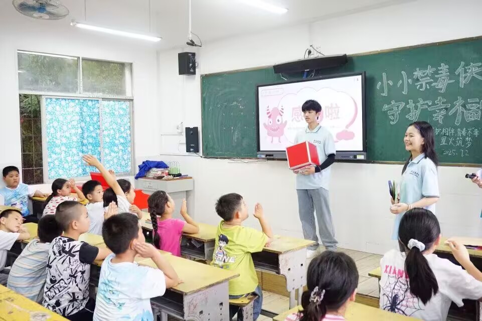 7月,實踐隊走進丹江口市蒿口鎮小學、柏林鎮小學、心橋志愿支教點 。活動以“青春無毒,共筑防線”為主題,隊員攜帶創意宣傳道具入校,迅速點燃學生好奇心。講解中,將毒品危害、防毒技巧融入“禁毒飛行棋”等趣味游戲,讓知識傳遞告別枯燥。孩子們在歡樂互動里,逐步建立防毒認知,為純真校園筑牢“無毒”安全屏障 。