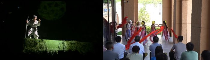 《再回延安》劇照(左)實踐隊員演出《東方紅》(右)