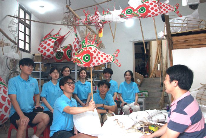 圖為實(shí)踐團(tuán)成員和汪老師交流魚燈技藝學(xué)習(xí)心得場(chǎng)景
