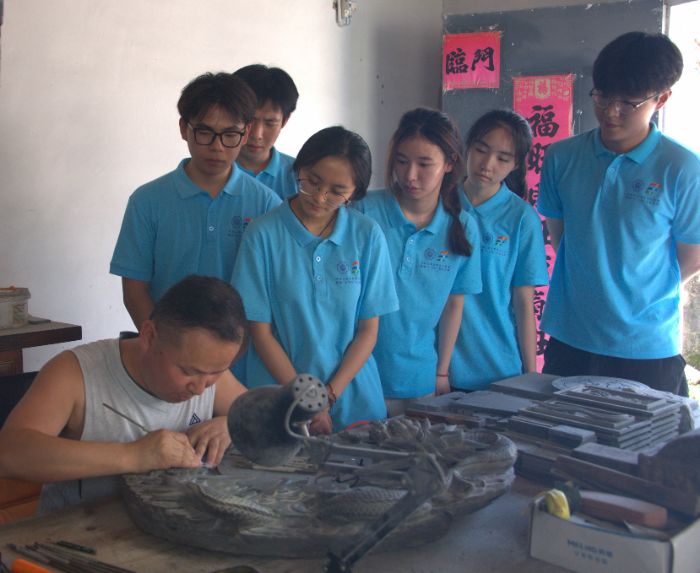 圖為實(shí)踐團(tuán)成員觀摩詹老師雕刻場(chǎng)景