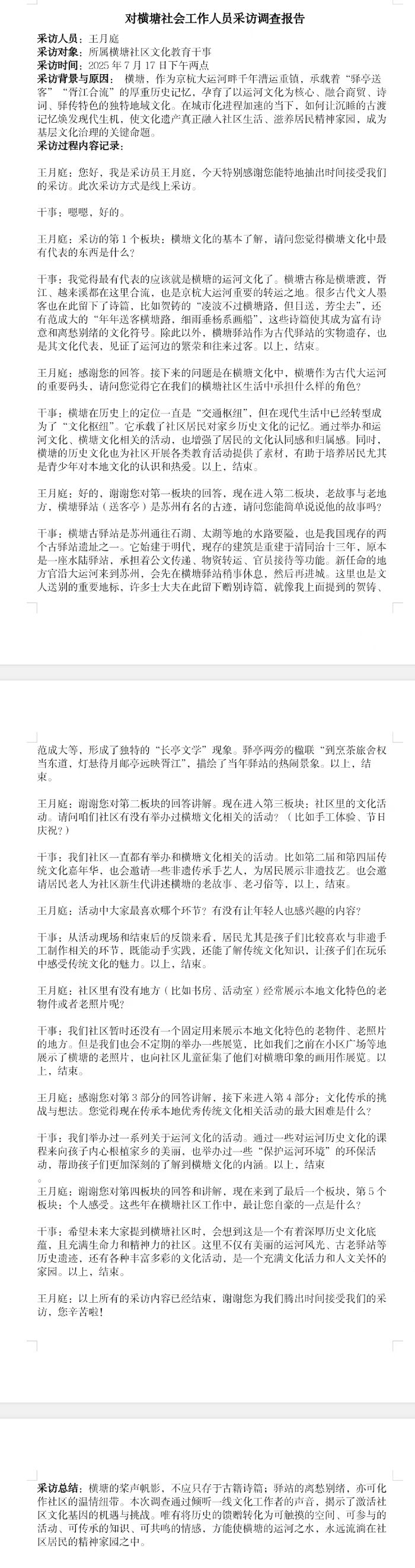 在城市化進程加速的當下,如何讓沉睡的古渡記憶煥發現代生機,使文化遺產真正融入社區生活、滋養居民精神家園,成為基層文化治理的關鍵命題。在2025年7月17日下午,團隊成員王月庭通過線上聯系的方式對所屬橫塘社區文化教育干事進行采訪。談及橫塘文化的代表,干事直指運河文化:"橫塘渡是京杭大運河重要轉運地,賀鑄、范成大等文人留下無數的詩篇,橫塘驛站更是見證吳地文化繁華的實物遺存。"如今,橫塘已從"交通樞紐"轉型為"文化樞紐",對于傳承面臨的挑戰,干事表示經常通過舉辦與當地文化相關的活動,增強居民的文化認同感和歸屬感,培養了居民對本地文化的認識和熱愛。本次調查聽取一線文化工作者意見,明晰社區文化基因激活的機遇與挑戰。要讓橫塘運河文化永續滋養居民精神家園,需將歷史文化資源轉化為可感知空間、可參與活動、可傳承知識及可共鳴情感。