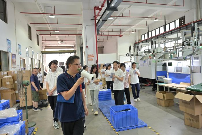 “氣球在他們手上好像有了生命”,實踐團成員感嘆道。每一根氣球、每一抹色彩,都凝聚著匠人的心血與智慧。在溫塘社區的老街巷中,團隊成員還偶遇了正在演奏古典音樂的老人,靈活的動作,專注的神情,處處流露著東城深厚的文化底蘊。 企業參訪:創新底色中的人文關懷 第二階段的企業參訪,為團隊打開觀察東城發展的另一扇窗。在多尼斯(國際)股份有限公司感受科技賦能的活力,在徐福記食品有限公司見識傳統制造業的創新轉型。感受東城企業創新氛圍,最后在覔書店體驗青年夜校,接受諄諄教誨,激發內生動力,破除職業發展焦慮。在實踐中,我們以鏡頭為筆、以音波為墨水、以腳步為引,體驗東城魅力。