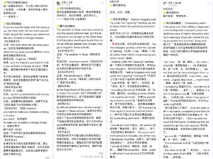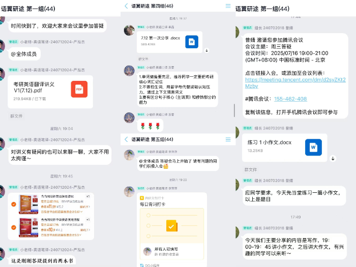 自7月10日起,志愿活動全面展開。每日清晨,學(xué)員會收到“晨間加油站”鼓勵信息及精選英語閱讀材料。每周三、周六晚間舉行小組線上答疑,共計開展40場,累計時長超100小時。答疑內(nèi)容不僅涵蓋解題方法,還包括備考心態(tài)調(diào)整與復(fù)習(xí)計劃制定。多位志愿者分享個人備考經(jīng)歷,幫助學(xué)員有效“避坑”,引導(dǎo)學(xué)員增強(qiáng)信心。