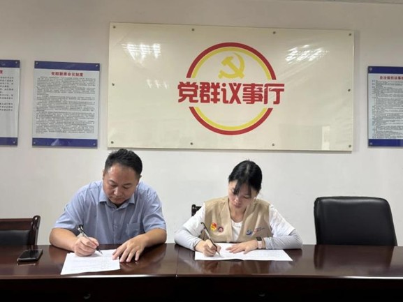 圖為何翠婷老師與村黨總支書記劉永紅簽署校社合作協議。崔欣善供圖