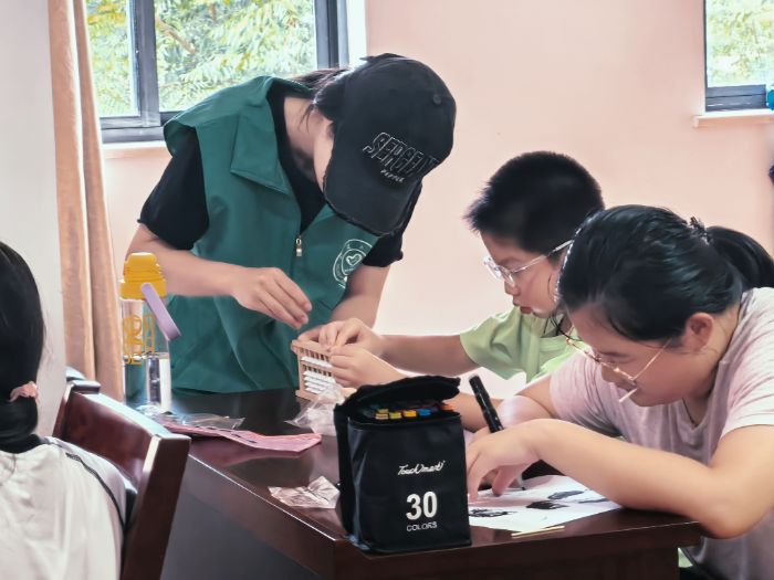 框架拼裝承古藝 課堂上,孩子們跟隨小“數”苗志愿者的教學一步步學習安裝凹槽木棍固定框架,再將小木棍精準穿入算盤珠、嵌入凹槽,小心翼翼地組裝著材料包里的木珠和框架。當第一個完成組裝的孩子撥動算珠發出清脆聲響時,整個教室都響起了掌聲。“我的算盤要畫上星星!”“我要把名字寫在上面!”彩筆在制作好的木質算盤上飛舞,每個孩子都在專心致志地打造屬于自己的“專屬算盤”。