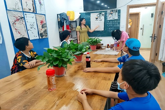 同樣,在山東省聊城市,也分布著遠(yuǎn)近聞名的“農(nóng)民國畫村”。該村落位于聊城臨清市松林鎮(zhèn),據(jù)實踐基地負(fù)責(zé)人介紹:“這個小小的村莊,卻有著60名農(nóng)民畫師,其中有7位畫師是省美協(xié)會員,另外還有100多名學(xué)美術(shù)的大學(xué)生。”實踐成員們便以當(dāng)?shù)氐膰嬑幕癁橐劳校哌M(jìn)村落為兒童們上了一堂別開生面的國畫課。活動中,團(tuán)隊成員以名家作品為案例,向?qū)W生們普及了青綠、淺絳、水墨、工筆、寫意等國畫基礎(chǔ)知識,并讓學(xué)生們親手操作,一筆一劃勾勒自己心中的美妙圖景。課后,學(xué)生們紛紛表示在課堂中感受到了國粹的魅力,表達(dá)了愿繼續(xù)傳承家鄉(xiāng)國畫文化的心愿。