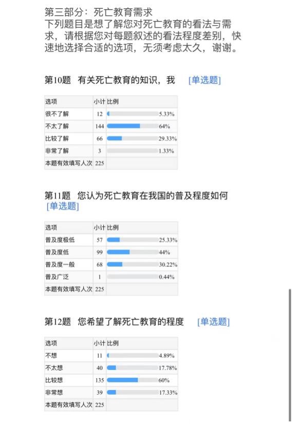 12月24日,線上問卷星制作完畢,成員通過微信、QQ、微博等方式轉(zhuǎn)發(fā)問卷星,截止2023年2月10日,共收集255份有效問卷結(jié)果。其中,男性受訪者70人,占31.11%,女性受訪者155人,共占68.89%。15歲-24歲人群以95.11%的比例占調(diào)查結(jié)果大多數(shù);12-15歲人群占0.89%、25-30歲人群占21.78%、30-60歲人群占2.22%。在對死亡教育的認知度這一項,64%的受訪者對死亡教育的知識不太了解,5.33%的人表示很不了解,29.33%的人表示比較了解,只有1.33%非常了解。同時,近60%的受訪者表示,應(yīng)該從小學(xué)或初中階段開始開展死亡教育,也有8%的人認為從啟蒙時期就應(yīng)該開展死亡教育。結(jié)果顯示,很多人對當前社會死亡教育普及程度不滿意,也希望盡早、全面開展相關(guān)教育工作。