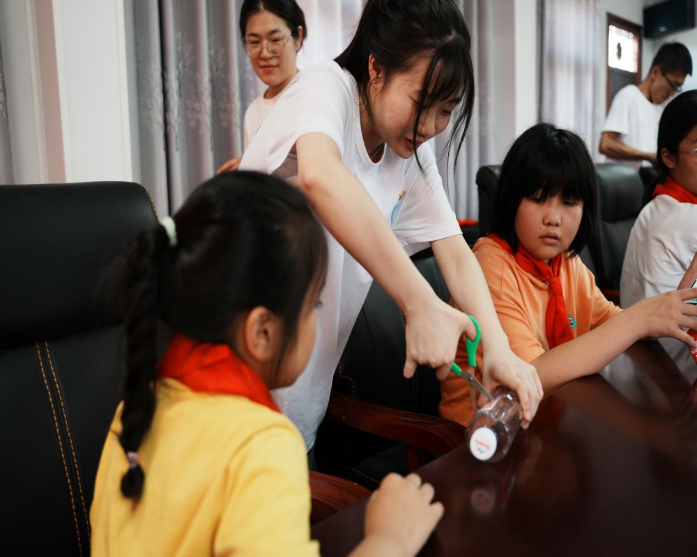 圖為志愿服務隊志愿者指導孩子用廢舊塑料瓶制作燈籠