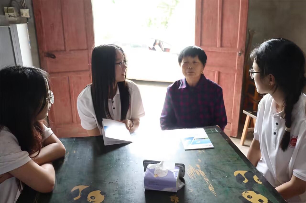 圖為實踐隊成員正在為王奶奶講解資助政策。