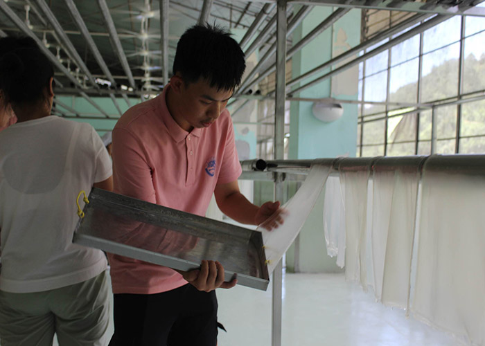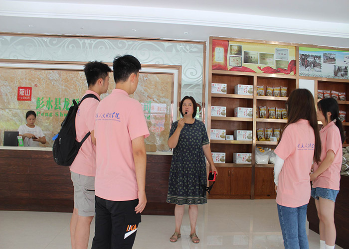 在郁山農業主任何洪樓的帶領下,調研小隊的成員們抵達彭水縣龍須晶苕粉有限公司實地調研。該公司總經理葛先萍親自為同學們講解,紅苕粉被視為彭水主要產業的原因,郁山晶絲苕粉為何要純手工制作以及郁山晶絲苕粉量產規模小的原因。通過葛總的講解,成員們了解到,郁山晶絲苕粉零添加、口感好、營養高其食用價值相比市場上的螺獅粉,酸辣粉以及方便面類更勝一籌。