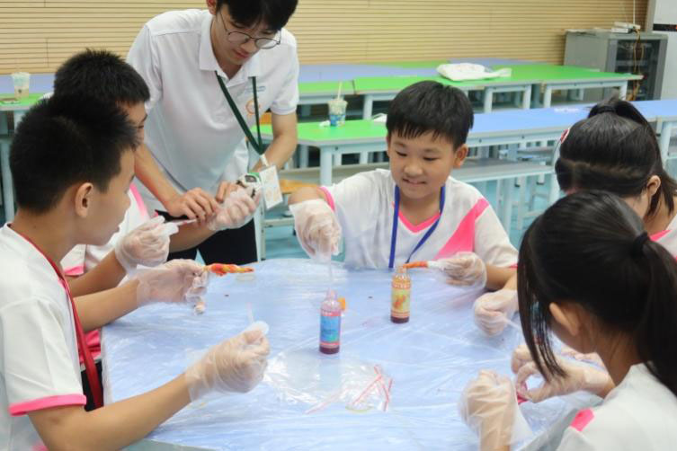 惠南實驗學校副校長介紹,本次實踐活動學生群體主要為學校周邊工業(yè)園區(qū)工人子女,其中大部分為隨遷子女。暑假期間,子女在家無人看管問題是工人們最大的擔憂。為解決園區(qū)工人的后顧之憂,隊伍設計了十天的趣味課程,利用師范專業(yè)優(yōu)勢,為當?shù)孛窆ぷ优畮戆踩殖鋵嵉呐惆椋盟鶎W技能傳遞教育溫度。