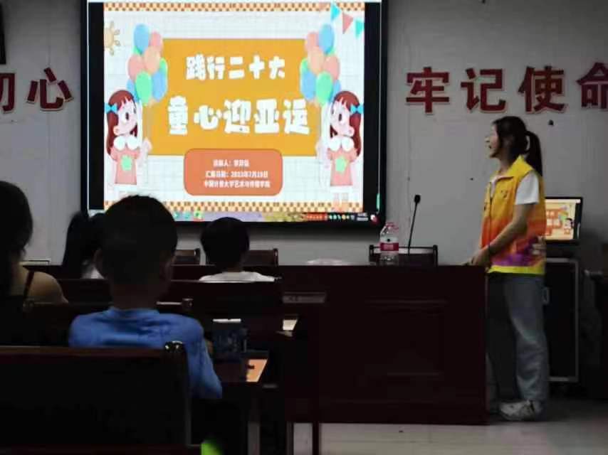 多彩課程促成長(zhǎng)少年強(qiáng)則國(guó)強(qiáng),少年進(jìn)步則國(guó)進(jìn)步,為培養(yǎng)孩子們的獨(dú)立能力增強(qiáng)孩子們的綜合素質(zhì),“藝童前行”小隊(duì)討論決定在開(kāi)展兒童心理調(diào)研的同時(shí)安排多類(lèi)文化教育課程培養(yǎng)孩子全方面發(fā)展,團(tuán)隊(duì)成員在課程設(shè)計(jì)上交流溝通,發(fā)揮所長(zhǎng),積極配合。亞運(yùn)志愿者李羿佳同學(xué)介紹亞運(yùn)項(xiàng)目和亞運(yùn)榜樣,鼓勵(lì)孩子們繪制亞運(yùn)主題手抄報(bào)一起為亞運(yùn)加油;“體育健將”唐語(yǔ)悅同學(xué)陪孩子們打太極拳強(qiáng)身健體,品味中華傳統(tǒng)文化;紅十字會(huì)救護(hù)員嚴(yán)淑寒同學(xué)模擬情境講解急救知識(shí),為孩子們的健康多加一重保障……