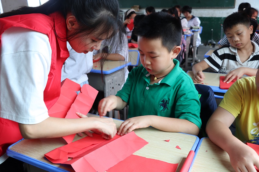 圖為實踐團成員上“紅紅的中國年”主題剪紙課 龔艷星 攝