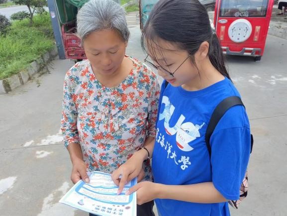 圖為實(shí)踐隊(duì)員給老人進(jìn)行科普