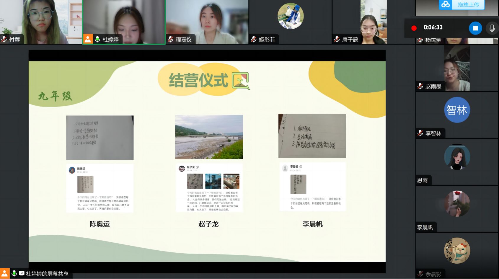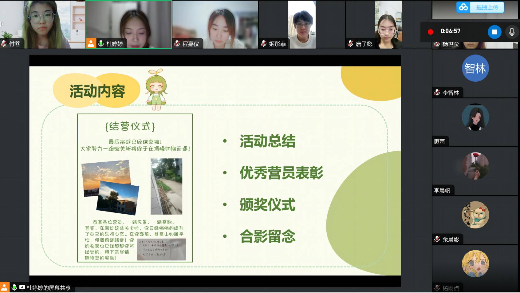 主持人先帶領大家回顧這個訓練營的四周活動,在訓練營期間營員們完成了精彩的成長海報,展示了自己的成長歷程并展望了未來的夢想;他們還記錄了自己的小豆芽成長記錄,分享了成長中的點點滴滴......