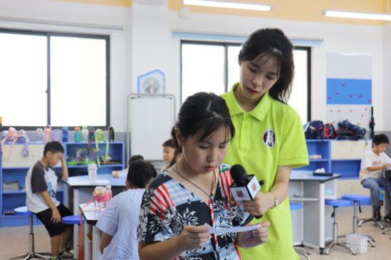 實踐服務(wù)團(tuán)成員與小朋友模擬財經(jīng)新聞播報