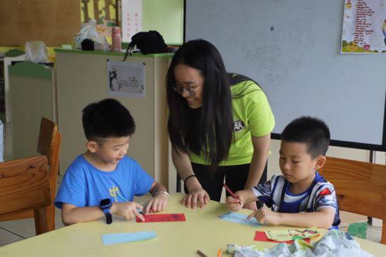 實踐服務(wù)團(tuán)成員向小朋友們普及合理消費觀知識