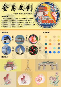 - 首先我們從金昌市的標志性建筑以及標志性物品等入手。將金昌的地表景點、工藝文化、市花等城市特色通過插畫的形式展現出來。使其更加靈動直觀的表現出金昌的文化韻味。地表景點從下往上依次是驪軒古城、金娃娃、鐘鼓樓和礦山公園,同時還繪制了金昌的市花月季花。與特色建筑結合,一起展現金昌的獨特風光。除此之外地毯制作在金昌屬于非物質文化譴產,在文創設計中用地表建筑和市花穿插在一起,表現出金昌文化多元化。