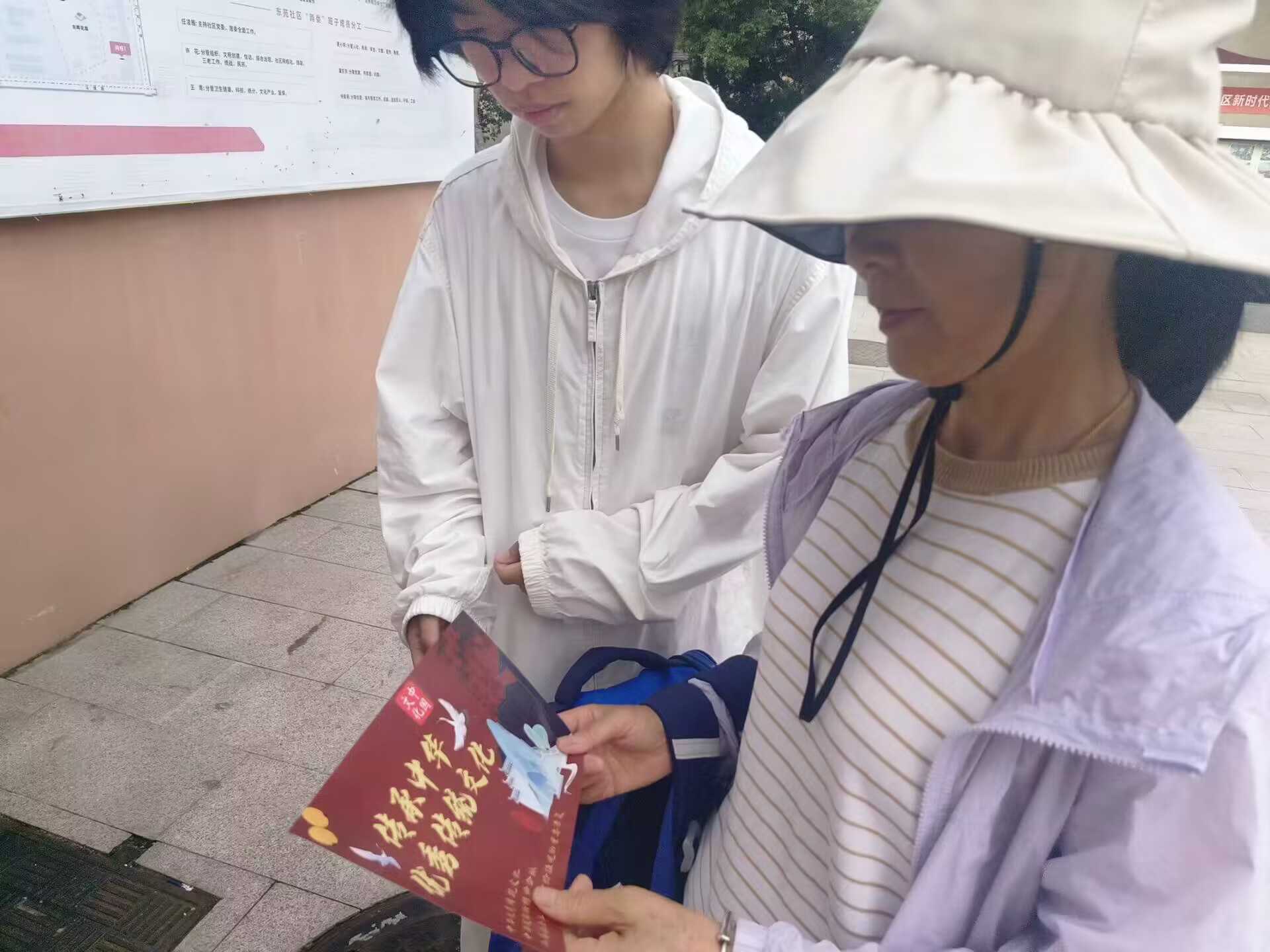 之后是通過(guò)傳單對(duì)小廣場(chǎng)上的群眾進(jìn)行宣傳優(yōu)秀傳統(tǒng)文化。初到這里,委員會(huì)前的小廣場(chǎng)上,零零散散的有許多人,他們?cè)谶@里享受著夏日的一個(gè)平靜午后。我在征求同意后隨機(jī)對(duì)路人進(jìn)行文化宣傳,一張宣傳紙由此引出了繪聲繪色的普及,我們?cè)龠M(jìn)行本次活動(dòng)之前做了充足的準(zhǔn)備,因此本次路邊宣講也算是完成的不錯(cuò)。在我幽默風(fēng)趣的談?wù)撝校麄冇械男Τ隽寺暎麄儾粫r(shí)的笑聲在樓宇之間回響,向大地丟去了一個(gè)個(gè)樂(lè)符,連著和煦的微風(fēng),奏唱起了一首歡快的歌。從稚童到老人,他們之間隔著幾十年,但這恰恰反映著文化的傳承。。