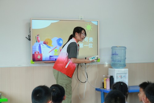 團隊成員在村委會的安排下于楊寨村幼兒園開展公益課堂,課堂以“祖國旗幟在我心”為主題,帶領小朋友們學習祖國旗幟、演唱紅色歌曲,學習紅色知識,培養孩子們的愛黨愛國情懷,讓愛黨愛國的精神根植在孩子們心中。針對幼兒園即將進入暑期假期,團隊還給兒童們帶來了“安全自護我知道”主題課堂,通過講做并舉的方式,幫助兒童掌握居家安全的相關知識,提高安全意識,兒童們積極互動,反響熱烈。團隊在實踐過程中關注鄉村兒童的成長,結合專業特長,實地調研楊寨村鄉村教室光環境和健康照明情況,并對鄉村兒童的視力健康進行了調查研究。
