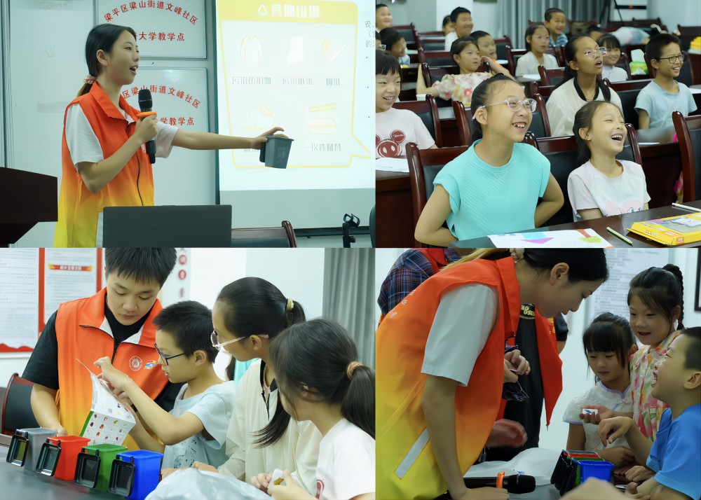動動小手,物歸其類。在此板塊中,志愿者引用圖片和視頻詳細(xì)介紹了日常生活中常見的垃圾種類,以及區(qū)別不同垃圾種類的方法和技巧。接著,利用模型教具,讓孩子們親自將印有不同垃圾圖片的卡片進(jìn)行分類,并放入相應(yīng)的垃圾箱模型中。在此過程中,孩子們充分發(fā)揮出事物認(rèn)知能力,運用生活常識圓滿完成了垃圾分類的活動。