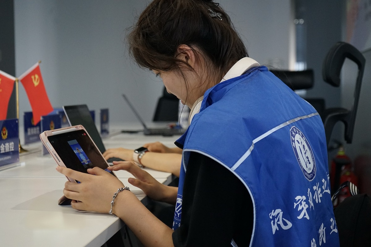 (圖為實踐隊成員在預警勸阻崗位登記信息 “法盾防詐”實踐隊 韓昊宇 供圖)