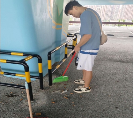 在清潔過程中,實踐團隊發現公園的清潔工人在鏟除暴雨裹挾在地面上的淤泥,實踐隊員們都自告奮勇幫助工人們鏟除淤泥,不但減少了工人們的勞動負擔,也進一步維護了社區的整潔面貌。