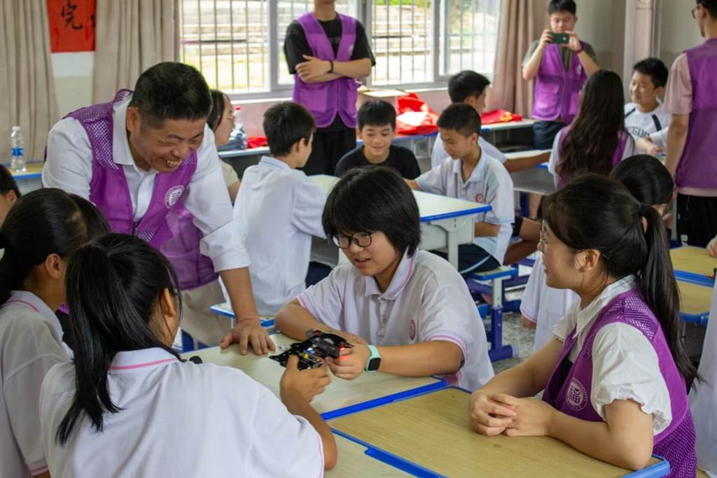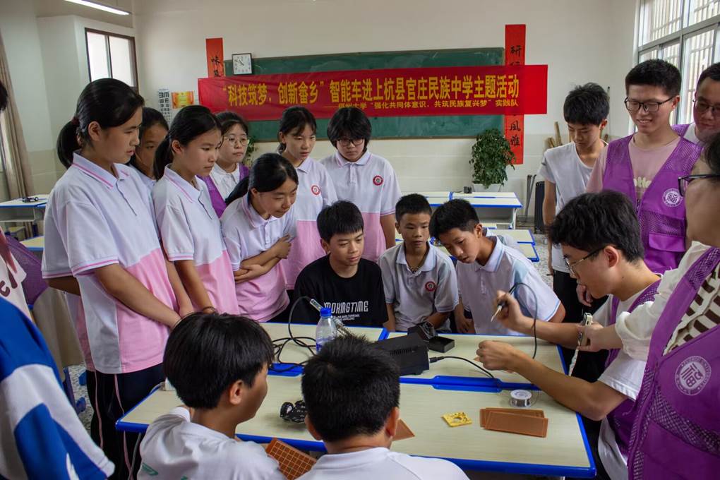專業賦能,助力少數民族學生科技啟蒙 實踐隊在此前與上杭縣官莊民族中學黨支部共建的智能制造工作坊中,順利開展“科技筑夢,創新畬鄉”智能車主題活動。隊員們發揮專業特長,為當地少數民族學生講解智能車的組成構造、工作原理、編程調試以及使用方法,并介紹了無人機、機器人等人工智能產品的發展動態。同學們充滿好奇,聽得津津有味,并在實踐隊員的引導下分組進行智能車調試。智能車語音控制、手勢控制、藍牙遙控……新奇的體驗讓同學樂在其中,教室里充滿歡聲笑語。