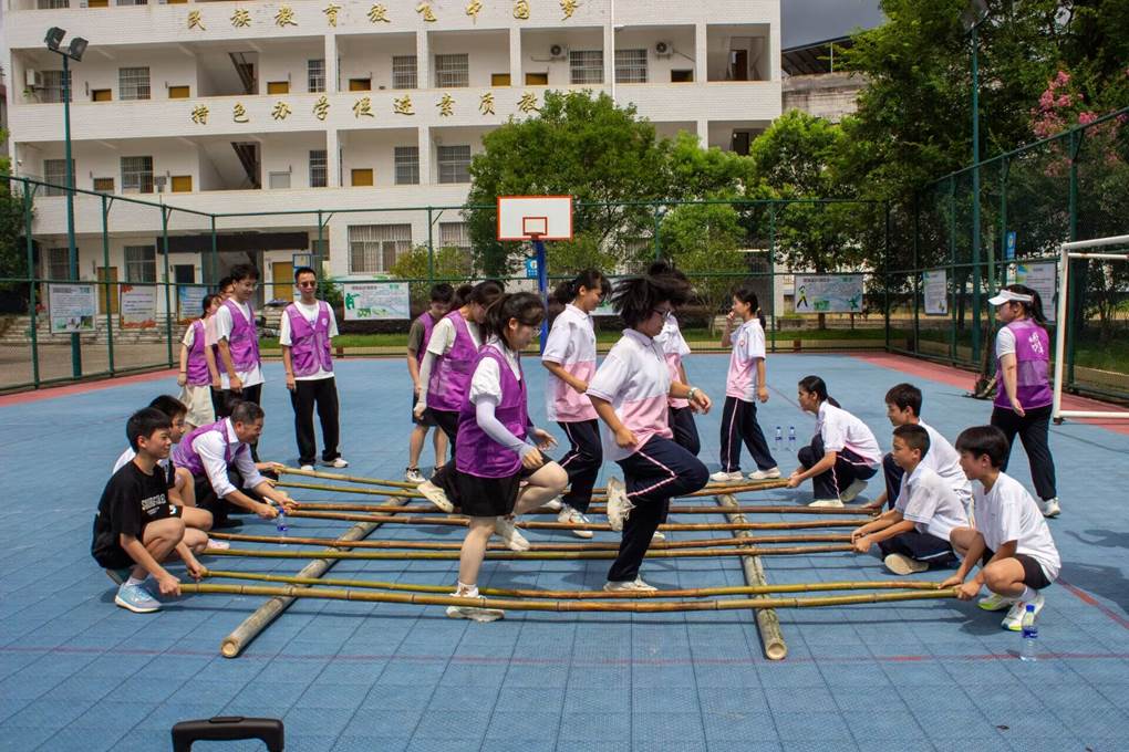 手拉手。伴著一路歡聲笑語,民族中學的同學們領著隊員們移步到戶外運動場,為實踐隊獻上了畬族舞蹈“竹竿舞”,并邀請隊員們一同加入,沉浸式體驗畬族民俗文化。