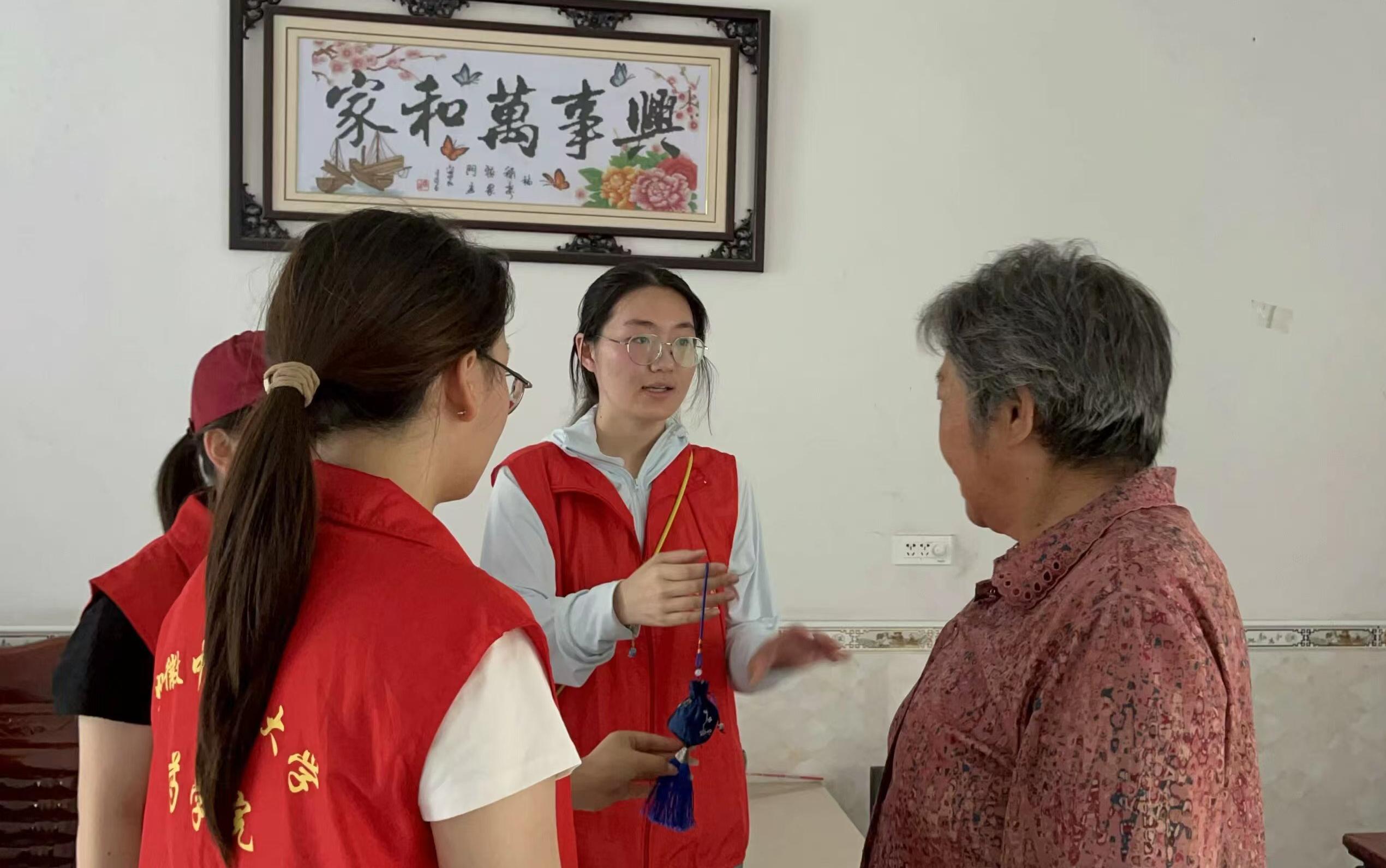圖為實踐團成員入戶宣傳中醫藥文化并送上香囊。欒秀英 供圖