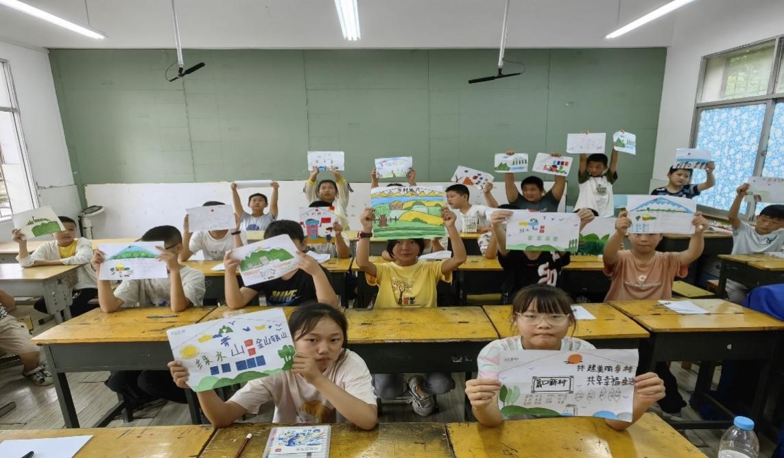 繽紛墻繪,繪出明日風采依照當地村委會要求,隊內成員發揮繪畫天賦,率先準備好墻繪設計,受到了領導們的一致好評和贊美。為了展現鄉村文化,團隊特地安排課程讓學生一同創作,共同設計心目中墻繪的設計。在課程上,主講老師先是幫助同學們尋找思路,例如根據當地紅色文化,鄉村振興,南水北調等,并且帶領他們觀看其它優秀墻繪作品,以此為基礎讓學生發揮想象力在白紙上繪畫出自己心目中想要設計的墻繪作品。在學生繪畫過程中,主講老師給學生分享了隊內成員進行的創作,與他們講解當地的風俗文化,副講老師也幫助主講老師一同幫助學生,解決他們在繪畫過程中的困難。在課程的最后,學生們高舉自己的設計作品,臉上滿滿都是自豪,都很開心為家鄉美麗建設提供了自己的一份力量。