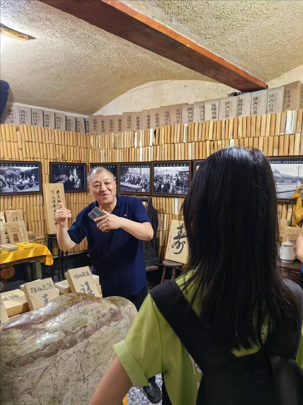 參觀結束后,團隊有幸采訪了第十三代茯茶制作技藝傳承人賈振先生。賈先生對中華優秀傳統文化的深沉熱愛,讓他矢志不渝地肩負起傳承茯茶技藝的使命。他敞開心扉,分享了茯茶制作的心路歷程,并強調了精益求精、專注專業的重要性。同時,他還介紹公司如何通過產業振興戰略,積極助力鄉村振興,實現經濟效益與社會責任的雙重豐收。在政府與匠人共同努力下,涇陽茯茶的品牌影響力日益增強,非遺技藝綻放出新的光彩。