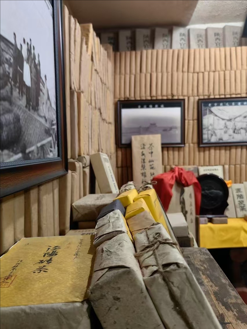 拾級而上,團隊成員步入二樓展廳,這里宛如一座茯磚茶的時光寶庫,不同年份的茯磚茶錯落有致地陳列,每一塊都承載著賈氏匠人的汗水與智慧,尤其是那些上世紀八十年代的茯磚茶,雖已失去飲用價值,卻成為研究茯茶歷史不可多得的寶貴資料。三樓作為茂盛店絲綢之路文化博物館,其中制茶工具琳瑯滿目,賈家匠人與國際友人共襄盛舉的影像資料,更是生動地展現了茯茶借助絲綢之路,跨越萬水千山,香飄海外,成為連接東西方文化的重要橋梁。