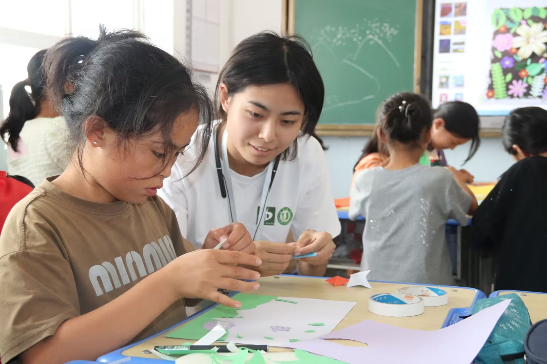 在柳泉新泉小學,由來自藝術學院的志愿者組織開展的美育類課程,成為當地孩子們心中的一抹亮色。活動特別融入了拼貼畫、扎染、漆扇等備受青少年兒童喜愛的藝術形式,豐富多彩的課程內容進一步激發了孩子們的創造力,同時也傳承和弘揚了中華優秀傳統文化。在拼貼畫的課堂上,志愿者引導孩子們利用日常物品和自然材料進行拼貼創作。孩子們采集身邊的樹葉、布片、舊書頁等材料,小心翼翼地挑選每一塊素材,用心布局,每一次粘貼都充滿了創造的喜悅,最終拼湊出一個個生動的故事。