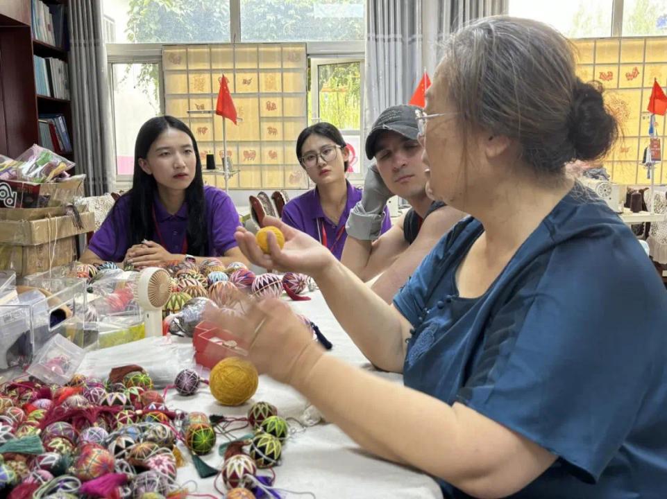 (圖為中外學(xué)子認(rèn)真學(xué)習(xí)非遺傳承人劉亞明老師講解的手鞠球制作技法 焦房喆攝)