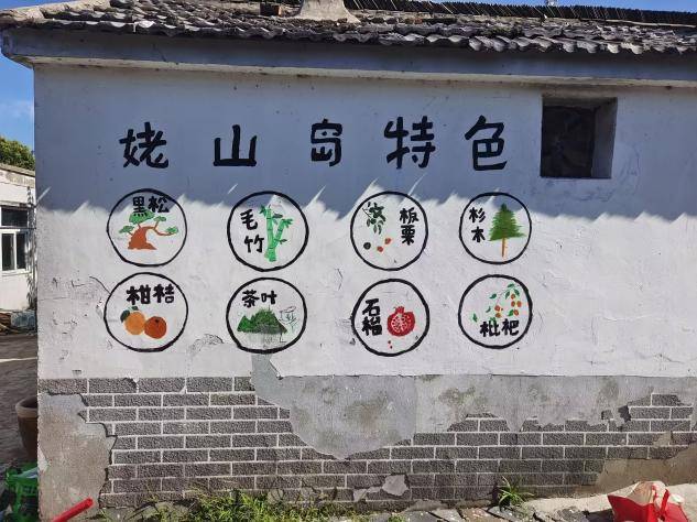 在姥山島繪畫過程中的這段時(shí)間,我深刻體會(huì)到了藝術(shù)與自然之間的和諧共生。這里的每一寸土地、每一片海域都成為了我們創(chuàng)作的靈感源泉。我們嘗試將自然的美麗與藝術(shù)的表達(dá)相融合,通過畫筆捕捉那些稍縱即逝的風(fēng)景,讓它們?cè)诋嫴忌嫌篮恪_@種融合不僅讓作品更加生動(dòng)傳神,也讓我更加敬畏自然,珍視這份來自大自然的饋贈(zèng)。我們利用當(dāng)?shù)氐谋就撂厣L(fēng)物特產(chǎn)來作為壁畫的標(biāo)本,利用姥山島一切客觀實(shí)物來繪畫。