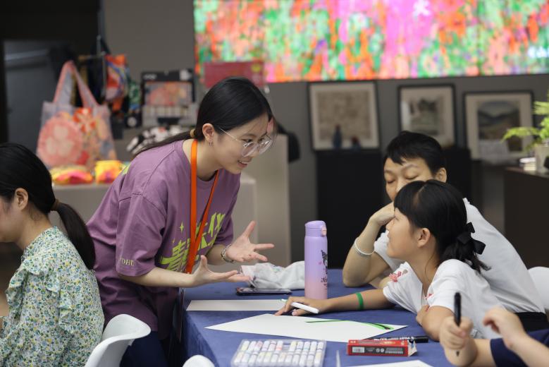 中期,實踐團來到東華大學機械工程學院“五育互促”區域聯動育人主題展上提出的“館校共建美育實踐基地”——上海藝術百代美術館,參與到其與松江新時代文明實踐中心聯合開設的美育浸潤課堂——“小小藝術家養成計劃”中,助力建立親子共享互動平臺,拓展美學教育新方式。同時,由工業設計專業學生設計的一日研學營研學手冊,將專業設計理念與教育實踐相結合,為參與者提供了一個全面、系統的研學體驗。工業設計專業學生通常具備扎實的設計功底、創新精神和創新能力,在產品設計、系統設計、服務設計等多個領域發揮專業優勢。通過“館校共建美育實踐基地”,進一步加強美育教育與科學教育的同頻共振,弘揚中華文化的深厚底蘊,同時為持續深化“社會大美育”課堂建設貢獻青年一代的力量與智慧,以實際行動充分展現青年風采,發揮青年擔當。