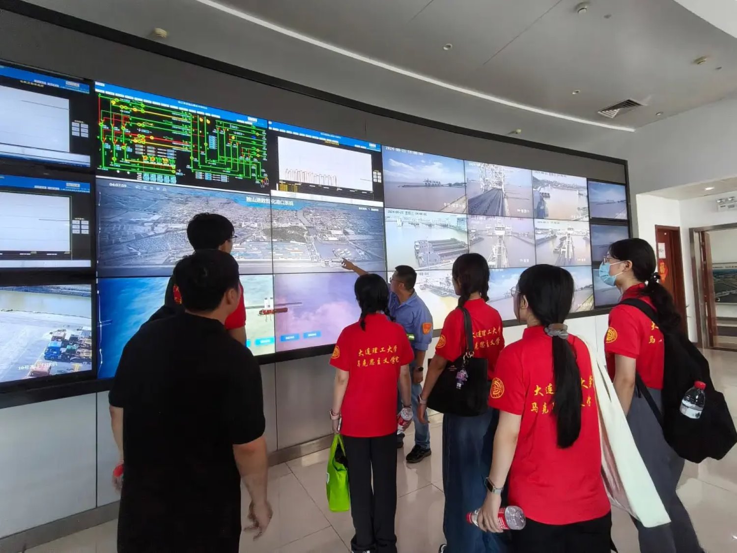 圖為沈老師在帶領(lǐng)“水鄉(xiāng)智韻”實(shí)踐團(tuán)成員參觀碼頭智慧控制中心,實(shí)踐團(tuán)成員攝。
