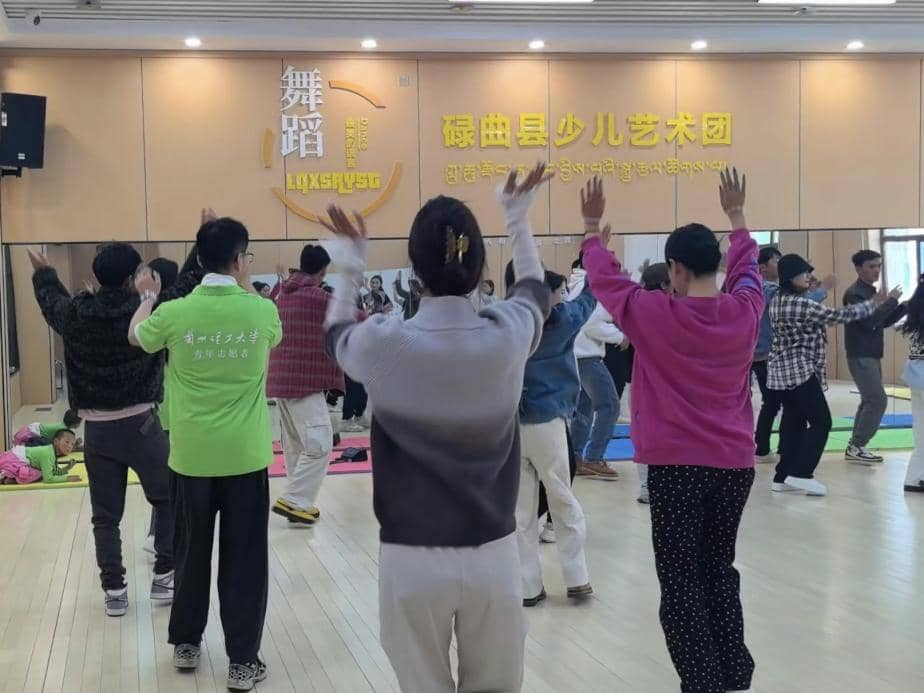 隨后,實踐團隊一行來到了碌曲民族文化演藝中心。碌曲縣作為“中國鍋莊舞之鄉”,通過每年舉辦鍋莊舞展演活動,向全國展示了當地的民俗風情以及各族人民團結奮進的精神風貌,而演藝中心就是碌曲縣歌舞團排練鍋莊舞的地方。團隊成員來到這里,不僅觀看了精彩的鍋莊舞表演,還親自加入了舞團的演練之中。大家手拉手、肩并肩,跳起了歡快的鍋莊舞。雖然舞步略顯笨拙,但那份對傳統文化的敬畏與熱愛卻溢于言表。在演練結束后,團隊成員們圍坐在舞團杰出代表萬瑪多吉與加參道杰身旁,聆聽他們講述鍋莊舞背后的故事與傳承的責任感。碌曲縣文體與旅游局副局長和鍋莊舞協會會長旦知加更是用他四年來“流浪”于文化田野的堅韌與執著,為團隊成員們揭開了碌曲鍋莊舞文化的神秘面紗。讓人仿佛穿越時空,親眼見證了鍋莊舞在碌曲這片熱土上的生生不息與繁榮發展。