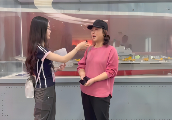 圖為實踐隊成員賈欣妍在采訪小講解員。 鄧卓 熙供圖