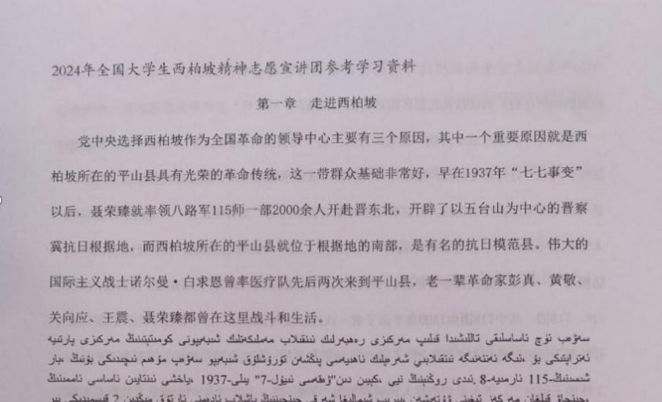 雙語宣講服務(wù)當(dāng)?shù)鼐用瘛?/strong>結(jié)合新疆維吾爾族自治區(qū)的語言特色,隊(duì)員木義色爾·艾尼完對紅色精神歷史資料進(jìn)行翻譯,用漢語+維吾爾語的雙語宣講方式將無形精神內(nèi)涵可視化,精準(zhǔn)傳達(dá)宣講內(nèi)容,準(zhǔn)確闡釋紅色精神。