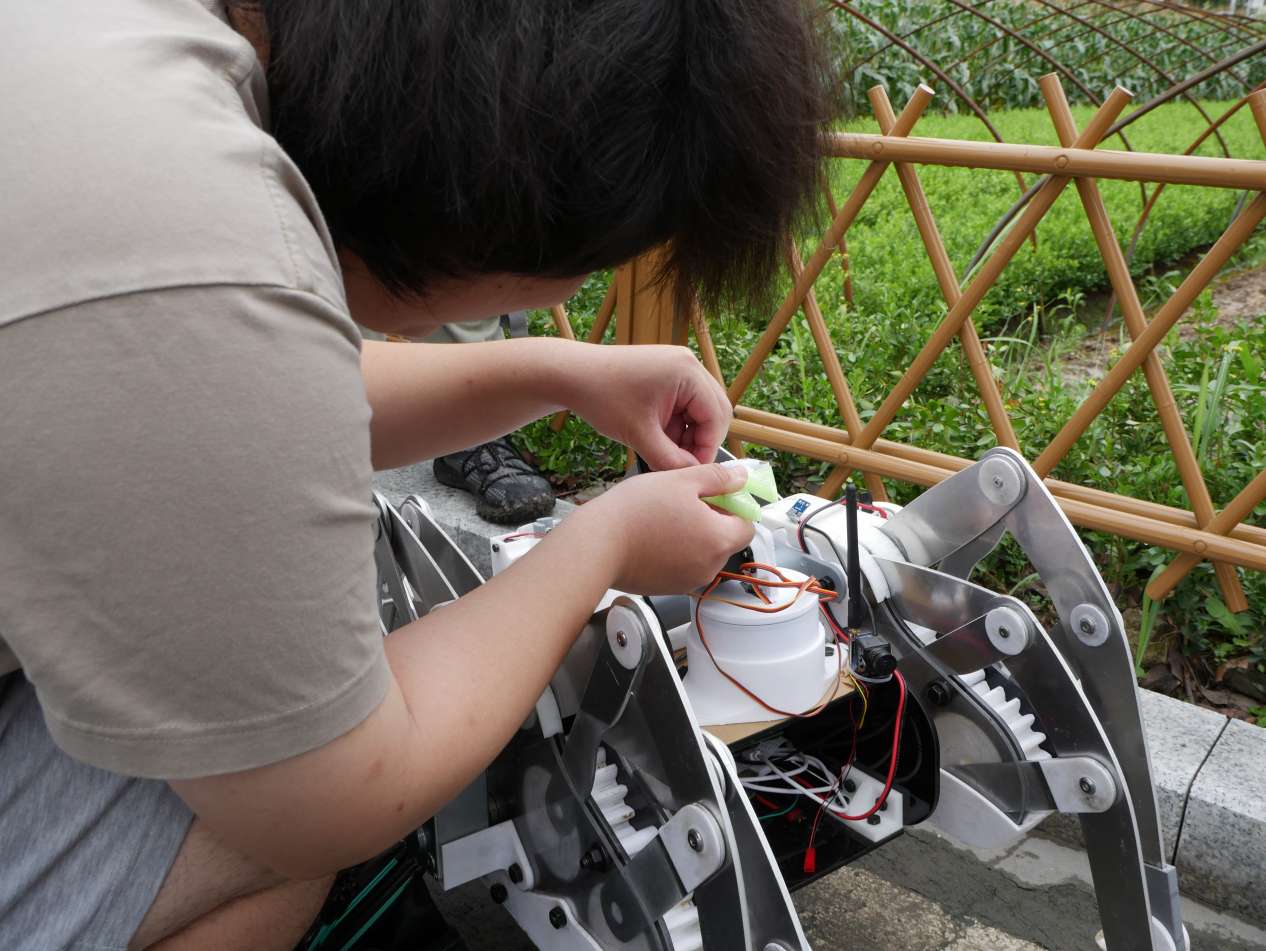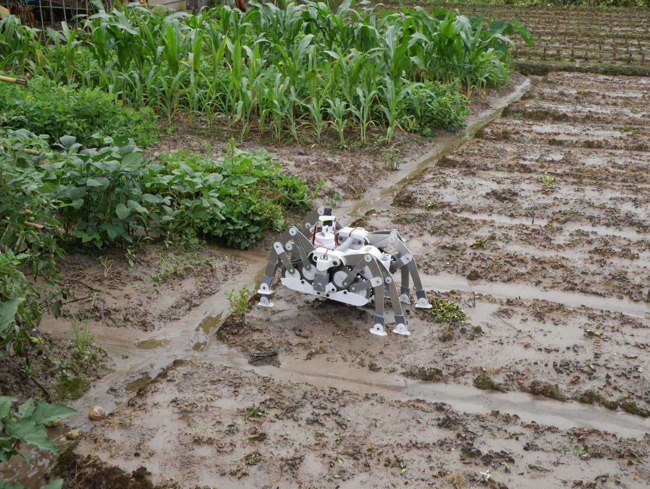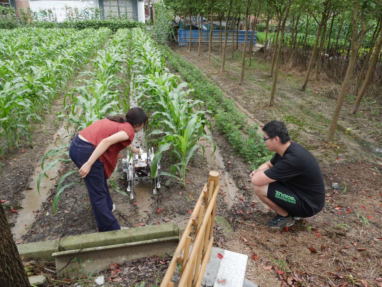 “數(shù)字定制,輔推效能”實踐團的“九眼智蛛”足式農(nóng)業(yè)套種機器人正在作業(yè)