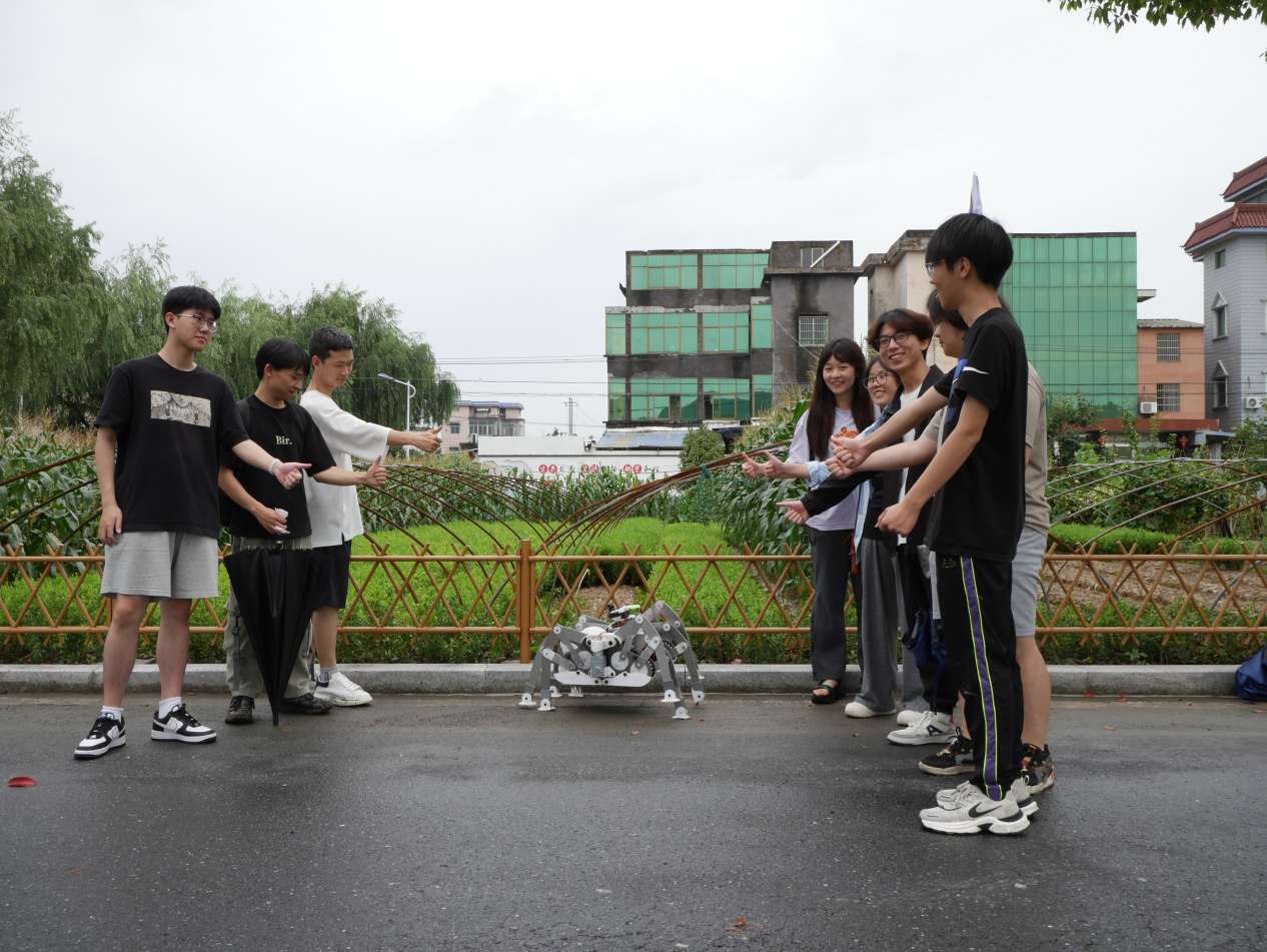 “數(shù)字定制,輔推效能”實踐團成員與“九眼智蛛”足式農(nóng)業(yè)套種機器人合影