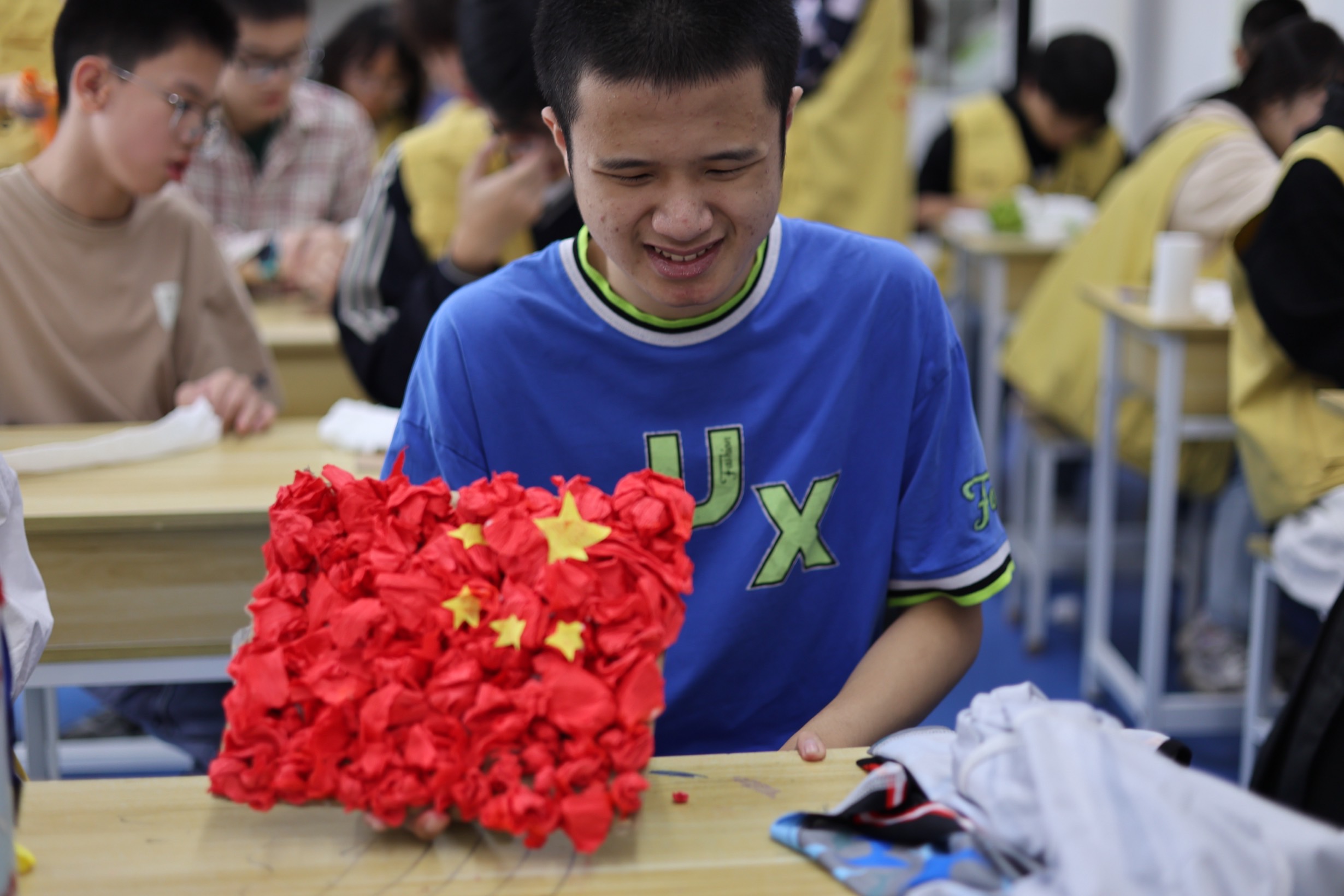 看似簡(jiǎn)單的紙張卻擁有無(wú)限的可能性,折疊、翻轉(zhuǎn)、包裹、固定……殘疾人朋友在學(xué)生志愿者的協(xié)助下,五彩斑斕的紙花競(jìng)相綻放,或嬌艷欲滴,或清新雅致。在慶祝祖國(guó)75華誕之際,他們用一朵朵栩栩如生的花朵向祖國(guó)母親獻(xiàn)上了最真摯的祝福和最美好的祝愿。