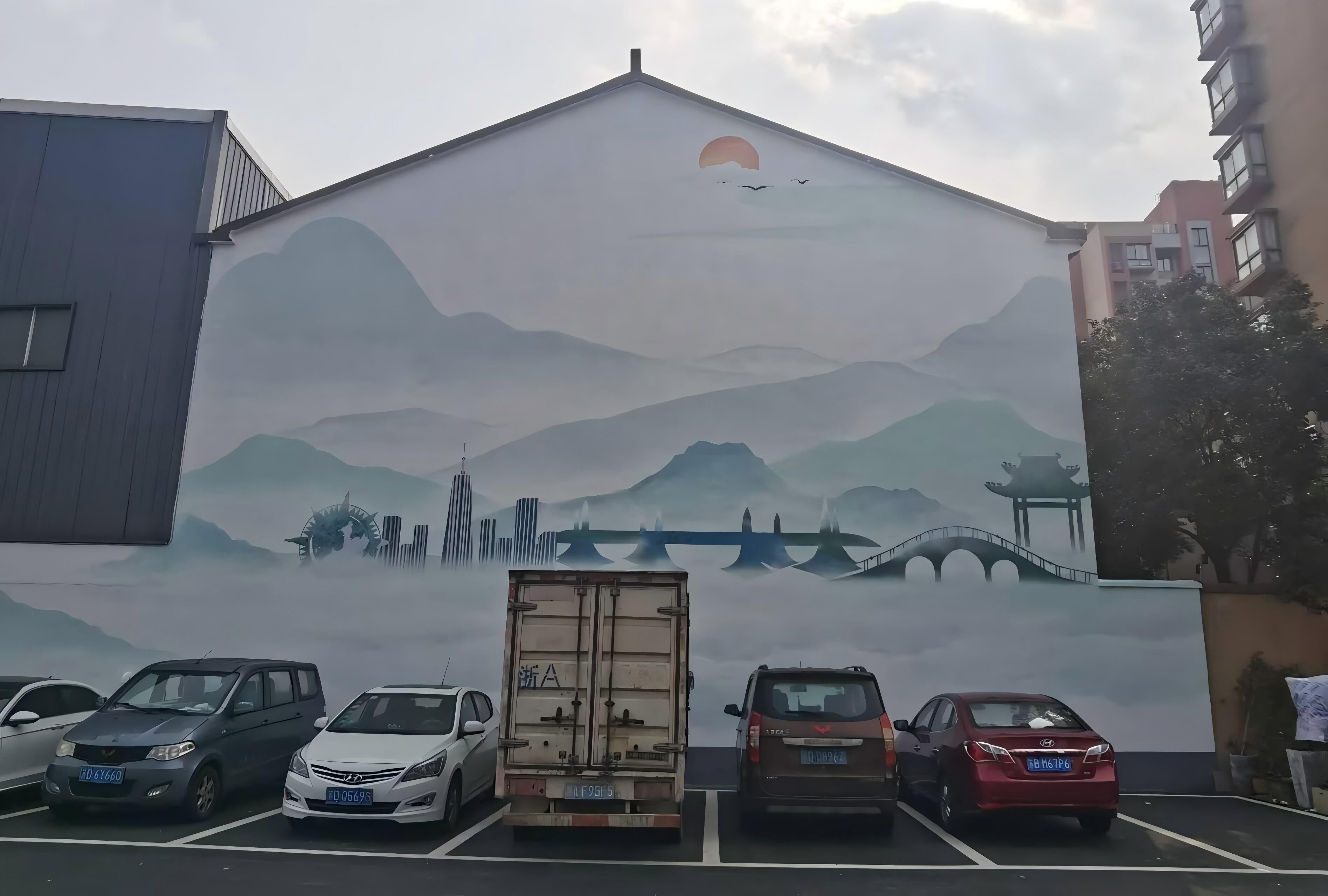 潘家村附近就是街道,車輛來往頻繁,過小的墻繪無法被來往行人與車輛吸引,所以這邊墻繪大多面積較大,而且都處于十字路口處,方面行人車輛能夠注意。街道處的墻繪理應具有地方特色 與宣傳功能,附近特有的景點、特色風光等都在墻繪上體現出來了。