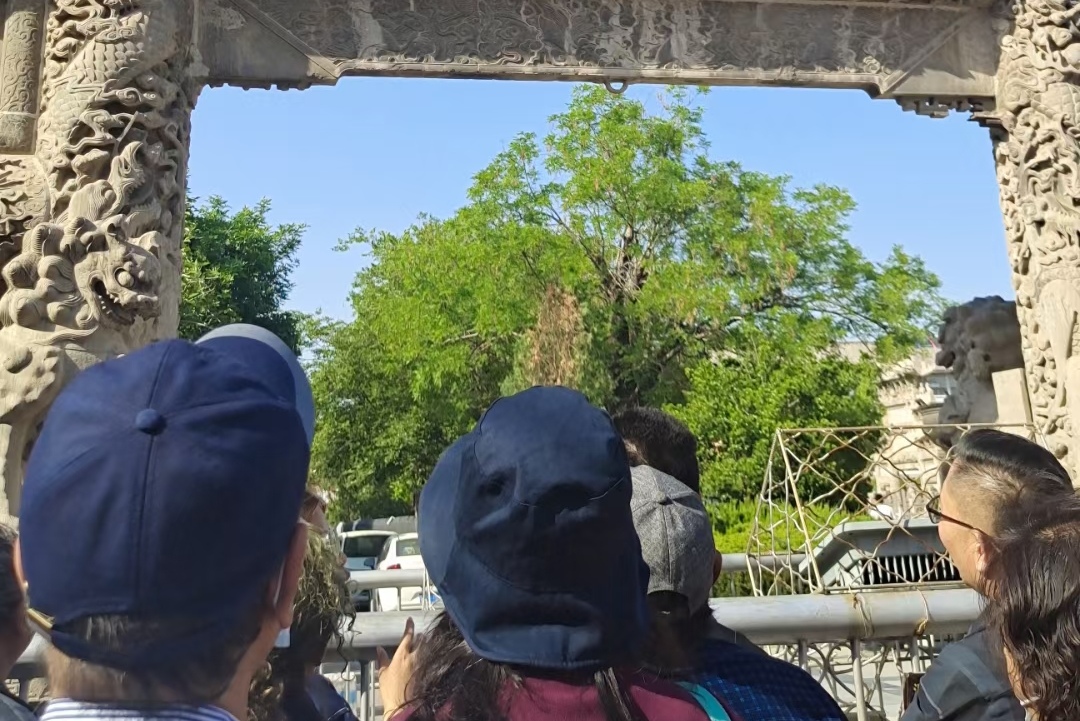 實(shí)踐首站,隊(duì)員們來到全國重點(diǎn)文物保護(hù)單位百壽坊與百獅坊。在講解員的帶領(lǐng)下,隊(duì)員深入研習(xí)兩座清代石坊的歷史淵源與藝術(shù)價(jià)值。始建于1765年的百壽坊,以百個(gè)變形篆體"壽"字雕飾聞名,其正間額枋的祥云飛鶴、次間浮雕的鸞鳳對(duì)翔,傳遞著"福壽萬年"的祥瑞寓意;而1778年落成的百獅坊則以百獅戲珠的靈動(dòng)之姿被譽(yù)為"天下第一坊",纏枝牡丹的透雕技藝深入盈尺,游龍祥云的動(dòng)態(tài)刻畫栩栩如生。隊(duì)員們借助設(shè)備對(duì)石坊的雕刻技法、紋飾符號(hào)進(jìn)行記錄,結(jié)合文獻(xiàn)資料梳理牌坊承載的孝悌文化、節(jié)烈觀念,深刻體會(huì)到古代工匠"以刀代筆"的藝術(shù)造詣與中華美學(xué)的精神內(nèi)核。