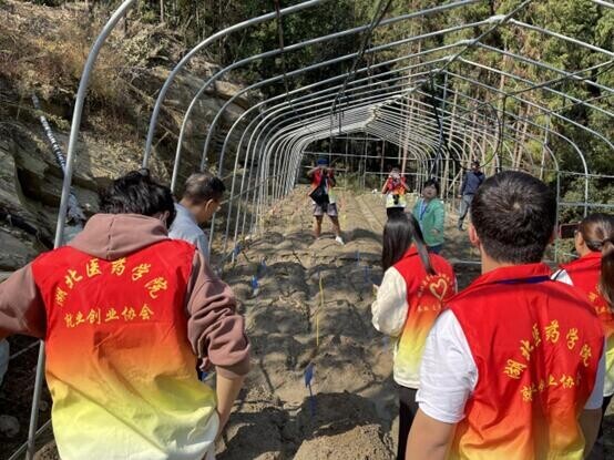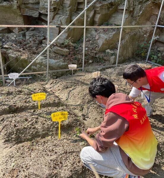 圖為團隊去到黃精種植基地參觀黃精苗圃,以及不同種類的黃精育種,并在鄭蘭蘭博士帶領(lǐng)下除去雜草的畫面。中國青年網(wǎng)通訊員 邵宗奇 供圖