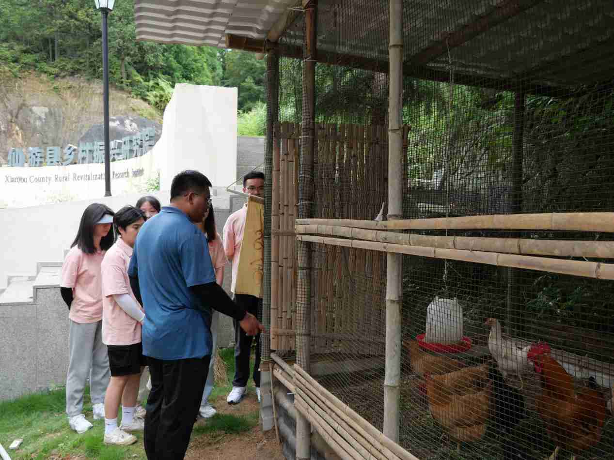 蔣呂洲為實(shí)踐隊(duì)成員介紹鄉(xiāng)村振興研究院 交流結(jié)束后,實(shí)踐隊(duì)先后參觀了鄉(xiāng)村振興研究院的庭院養(yǎng)殖、公益反哺的的鄉(xiāng)村振興農(nóng)特柜、無(wú)臭無(wú)味無(wú)污染的發(fā)酵床養(yǎng)雞技術(shù)等“黑科技”。在庭院養(yǎng)殖,寬敞明亮的庭院內(nèi),特色農(nóng)場(chǎng)品一覽無(wú)遺,一顆顆“嘉寶果”生機(jī)勃勃;公益農(nóng)產(chǎn)品柜羅列著具有莆仙特色的系列農(nóng)作物成品,每一次購(gòu)買(mǎi)都會(huì)捐出0.3元到“鄉(xiāng)建資金”助力鄉(xiāng)村建設(shè)。