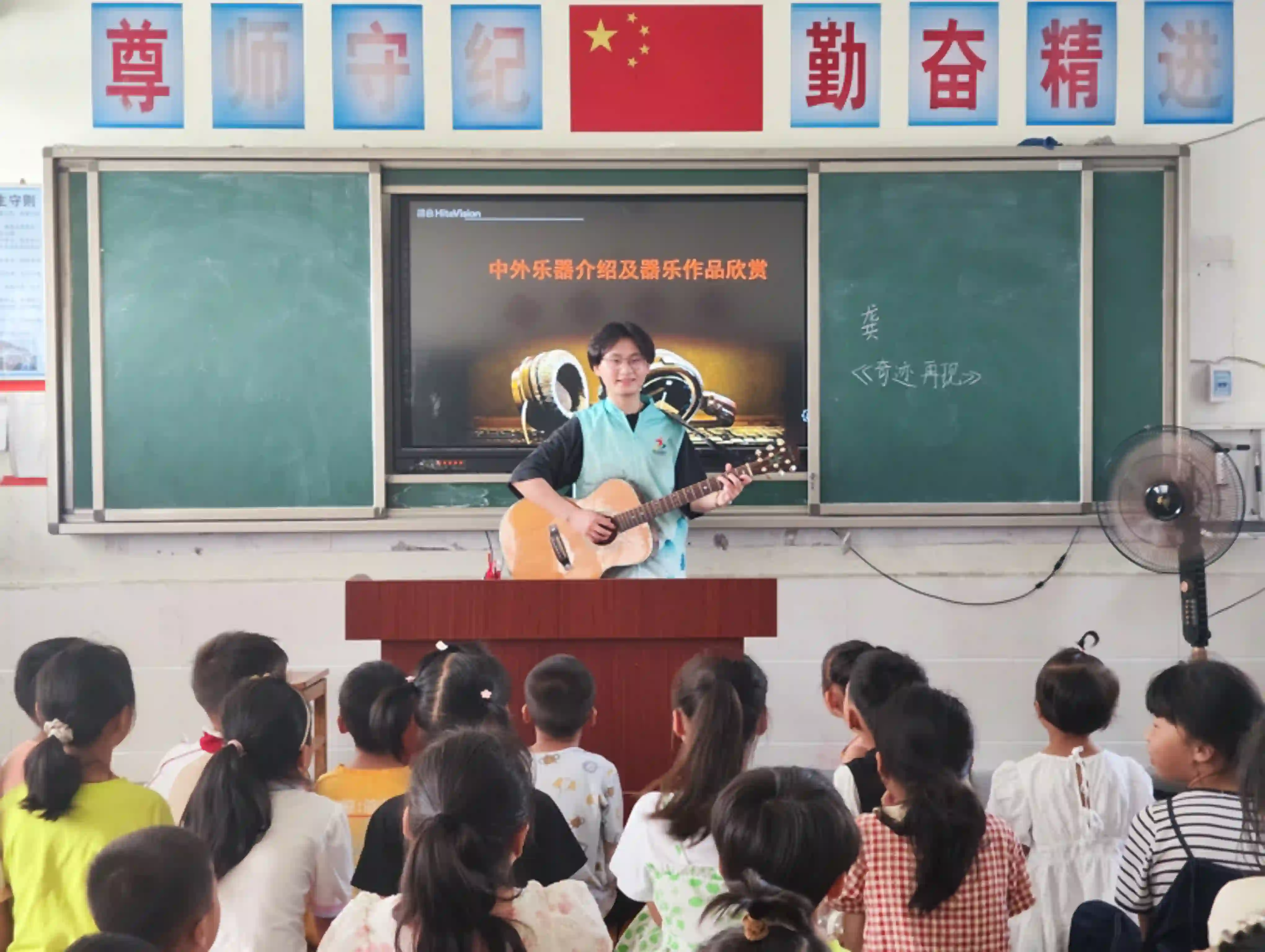 2023年7月9日上午,湖南師范大學(xué)文旅志愿服務(wù)隊(duì)的5名隊(duì)員來到了湖南省益陽市安化鎮(zhèn)煙溪鎮(zhèn)陳竹村的陳竹小學(xué)開展了不同于通常課程形式的藝術(shù)支教活動(dòng)。在這樣一個(gè)教育資源相對(duì)匱乏的山村,孩子們的學(xué)習(xí)環(huán)境并不是很好,但是從他們的眼神中我們可以看到那一束光,那一份童真和對(duì)知識(shí)的渴望。在這里,我們熱情洋溢的開展了支教活動(dòng),和鄉(xiāng)村的孩子們互動(dòng)交流,教授音樂知識(shí),分享快樂,收獲了自己的人生價(jià)值。
